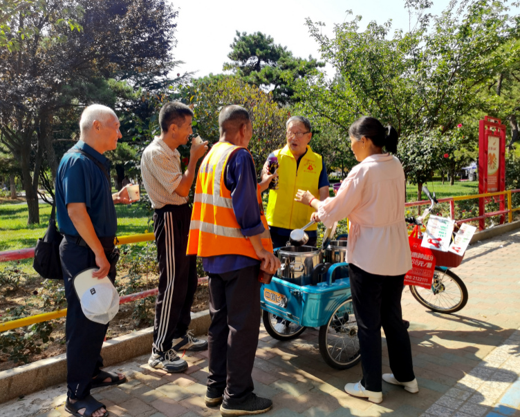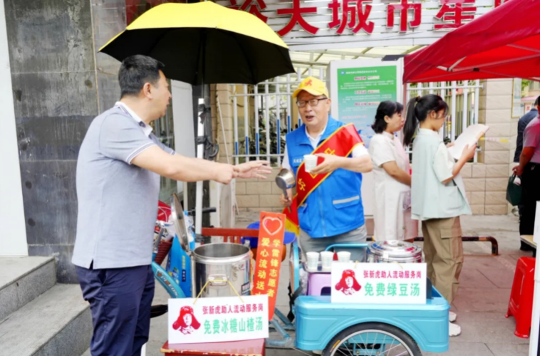 ▲每年三伏天,张新虎都会沿街为户外劳动者送绿豆汤、冰糖山楂汤。