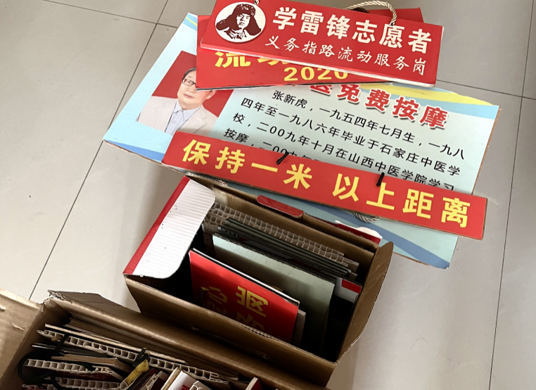 ▲这些年,张老师自制了五六十块志愿服务牌。