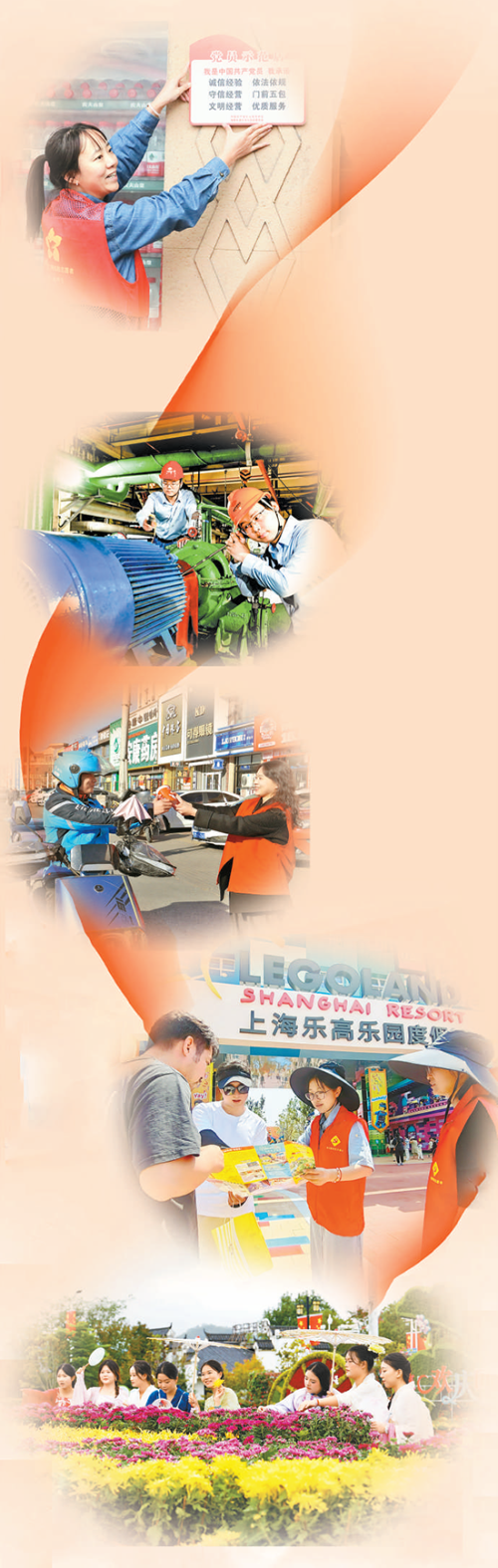 图④:为提升旅游服务品质,上海市金山区组织党员志愿者深入乐高乐园度假区,开展解难答疑、维护秩序、疏导人流等服务活动。